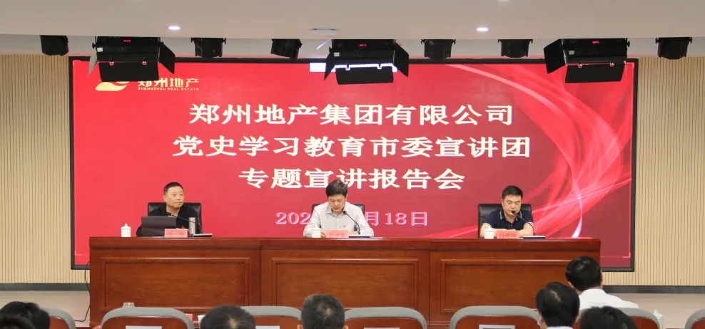 為持續推進黨史學習教育走深走實,5月18日上午,鄭州市委宣講團走進鄭州地產集團,在集團301多功能廳開展黨史學習教育專題宣講報告會。報告會由鄭州市委宣講團成員、鄭州工程技術學院馬克思主義學院副教授張豪主講,市國資黨史學習教育第二巡回指導組組長、四級調研員段德強,指導組成員張詩雨、陳祥斐到會巡聽旁聽,地產集團領導班子、總部全體員工,各子公司支部書記、黨建部門負責人等共計150余人參加現場報告會,各子公司員工共計170余人通過線上直播進行觀看,會議由地產集團黨委書記、董事長萬永生主持。
